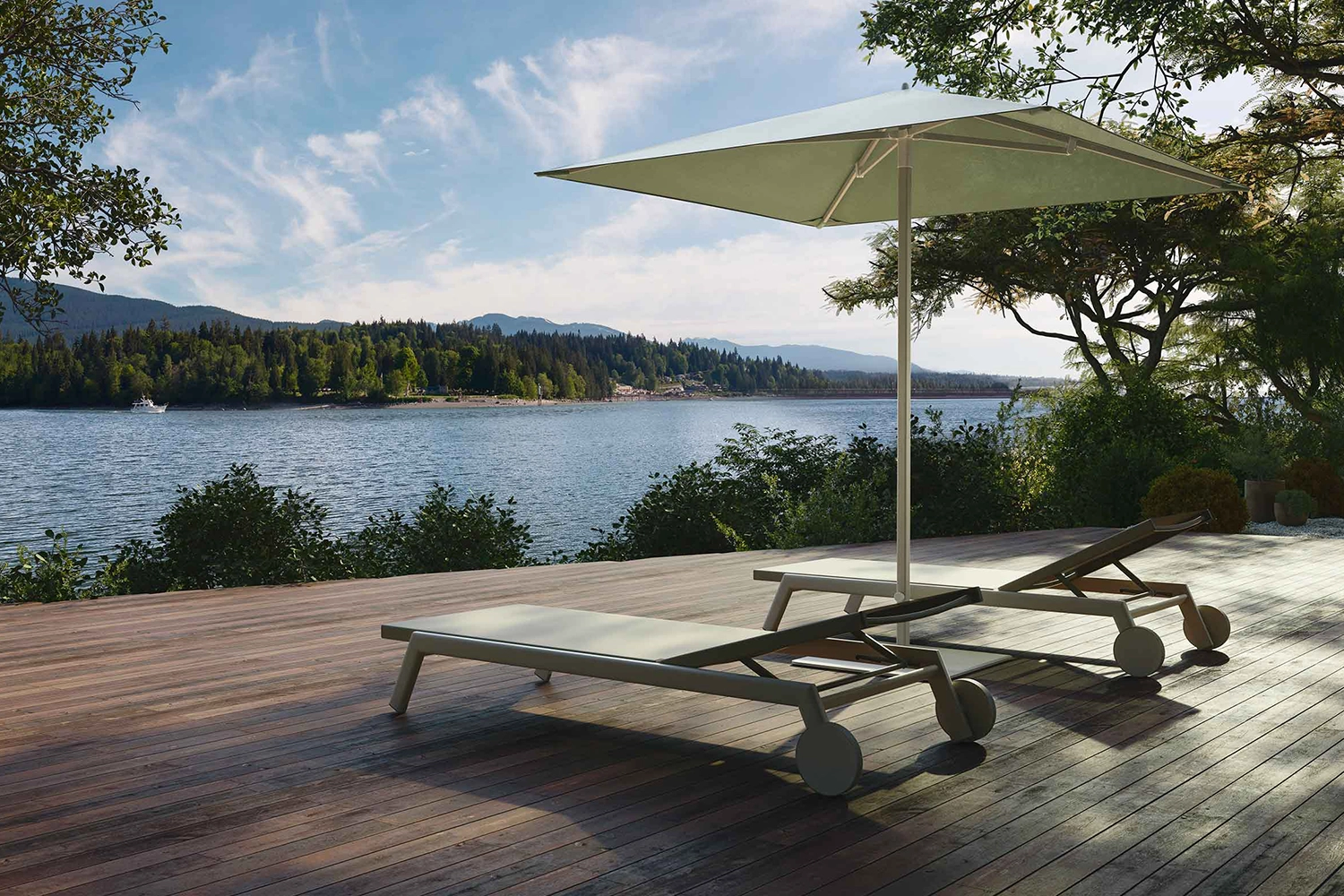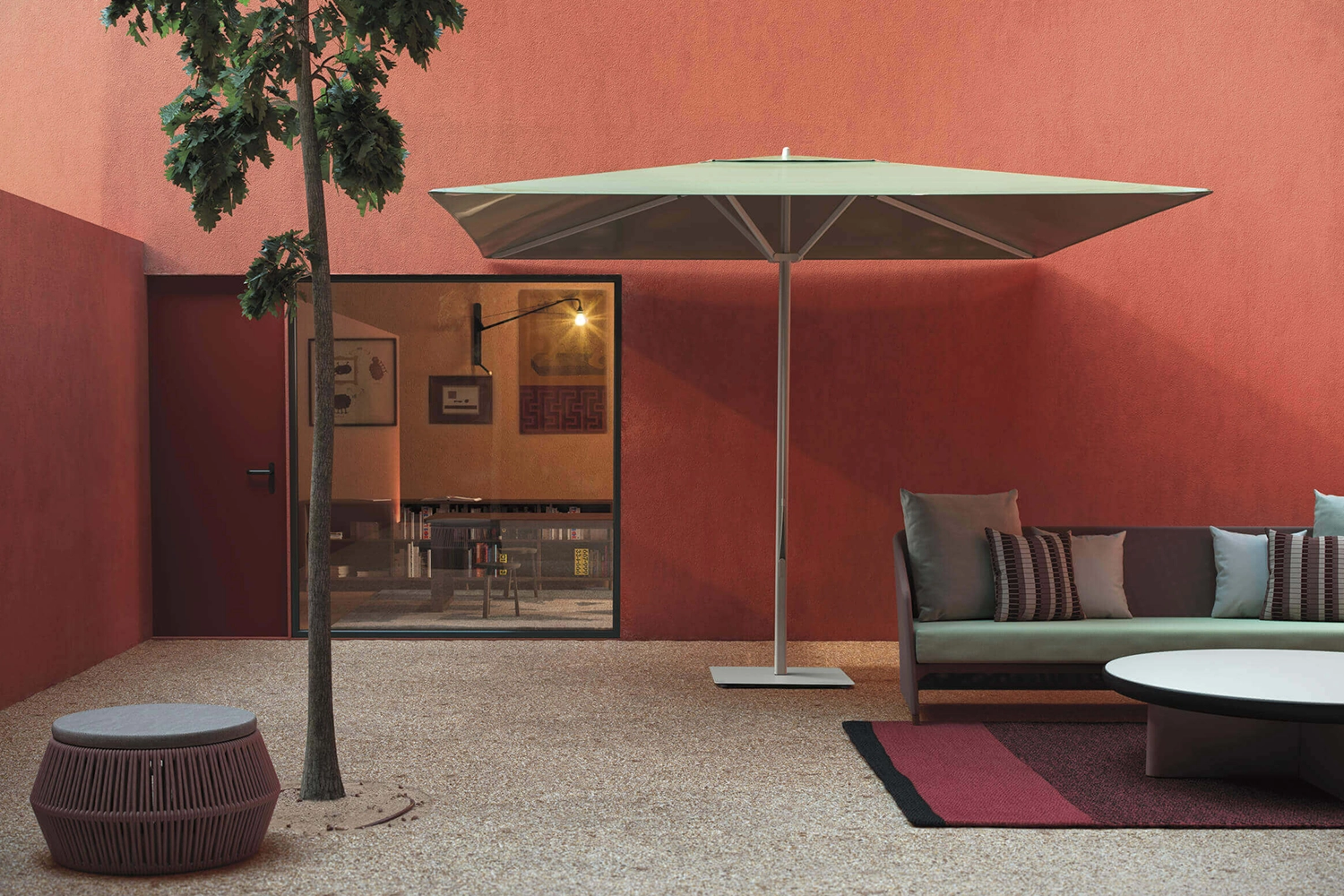 Com design funcional e presença marcante, o ombrelone Meteo protege com elegância e integra-se à paisagem contemporânea.