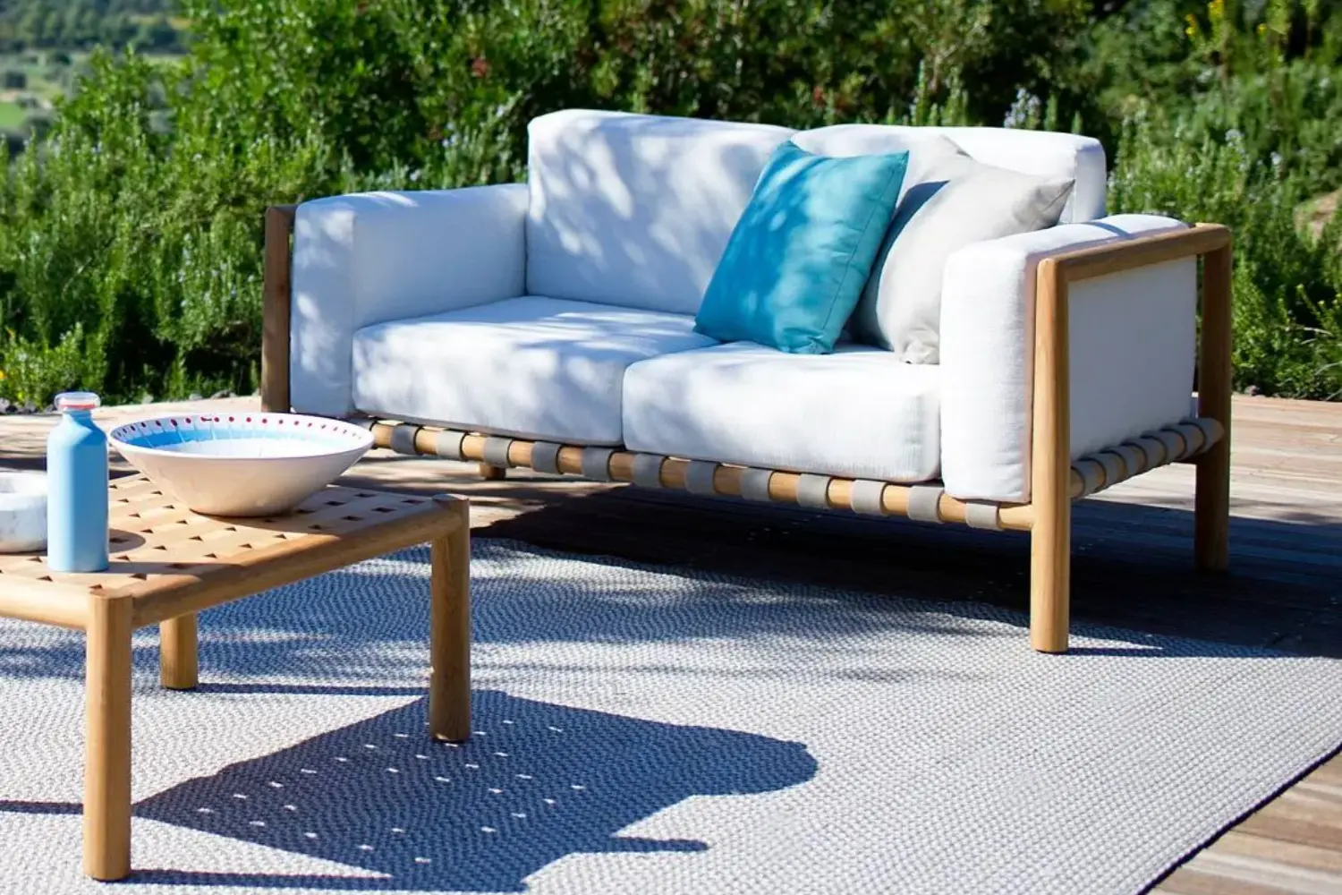 Elegante peça de teca e design limpo, o sofá Pevero oferece o conforto ideal para compor ambientes de lazer ao ar livre.