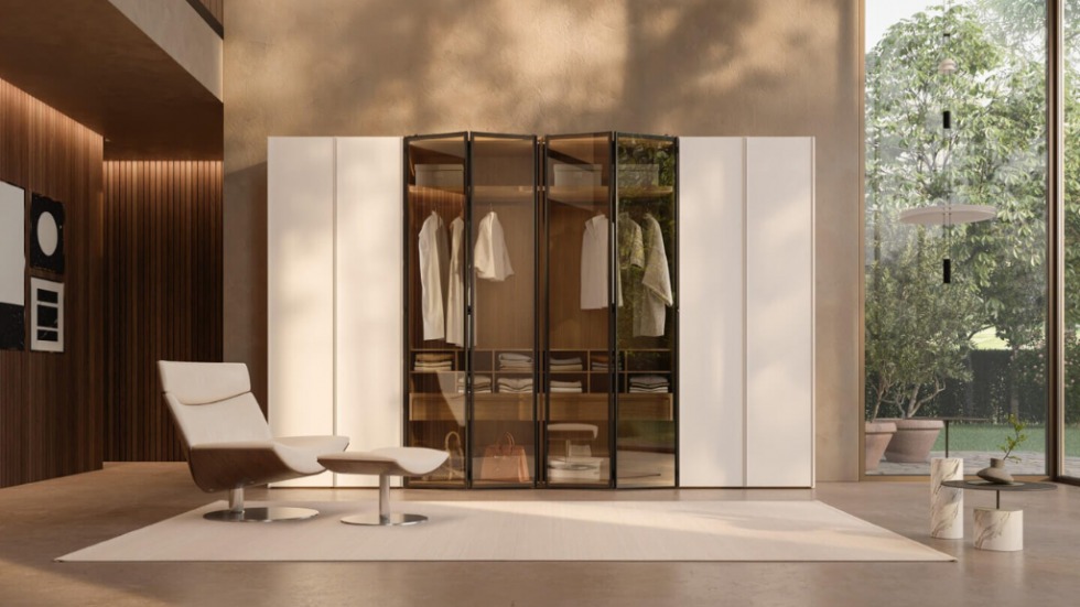 Na prática, vemos diferentes tipos de móveis e uma ampla gama de frentes: desde portas com armações de alumínio, de correr ou de abrir com frentes sólidas e acabamento texturizado, até painéis lisos com puxadores de altura total, integrados ou salientes.